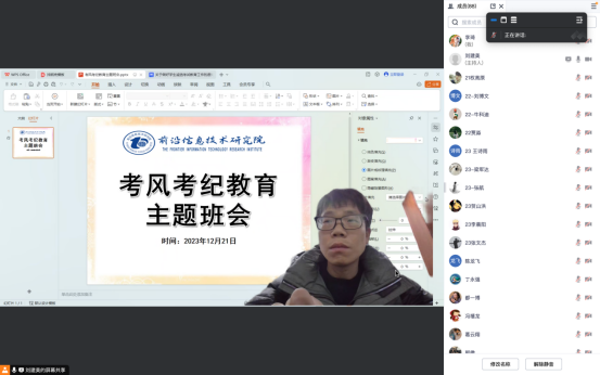 2023年12月21日晚,69书吧 召开“考风考纪教育主题班会”,此次班会采用线上的形式,由刘建美、刘长慧老师主持,全体研究生参加。