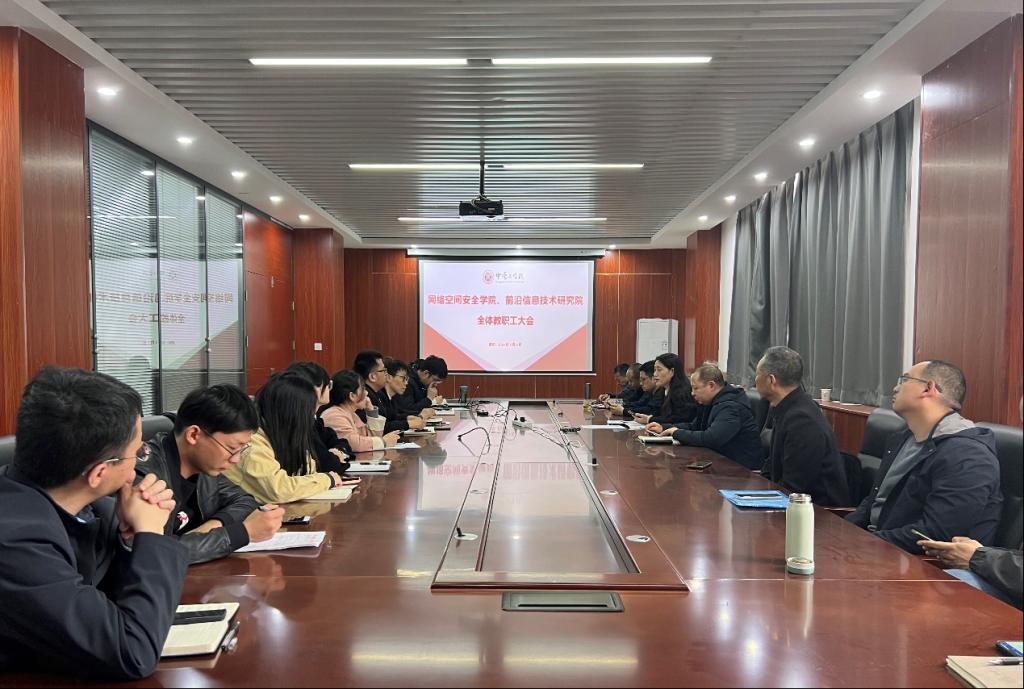 、前沿信息技术研究院召开全体教职工大会。会议由副书记闫丽霞主持,全体教职工参加。