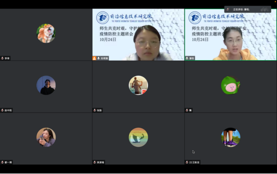 近期,疫情呈多点散发,形势严峻。为进一步强化学生遵规守纪意识,筑牢安全防范思想防线,69书吧 于10月24日晚8点召开“师生共克时艰 守护校园平安”疫情防控主题线上会议,副院长潘恒、研究生秘书刘长慧以及全体研究生参会。