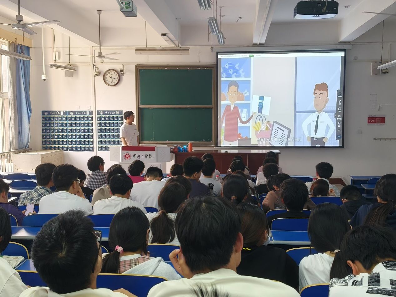 班会伊始,郭政良首先带领学生学习《中华人民共和国宪法》《中华人民共和国教育法》《中华人民共和国学位法》等部分法律法规,引导同学们更加深入的了解到作为学生所拥有的权利和义务。接着,他以学生日常学习生活密切相关的案例视频为切入点,结合校园暴力、校园电信诈骗、个人信息保护等多个方面,引导学生知法守法,切实提升自我保护能力。