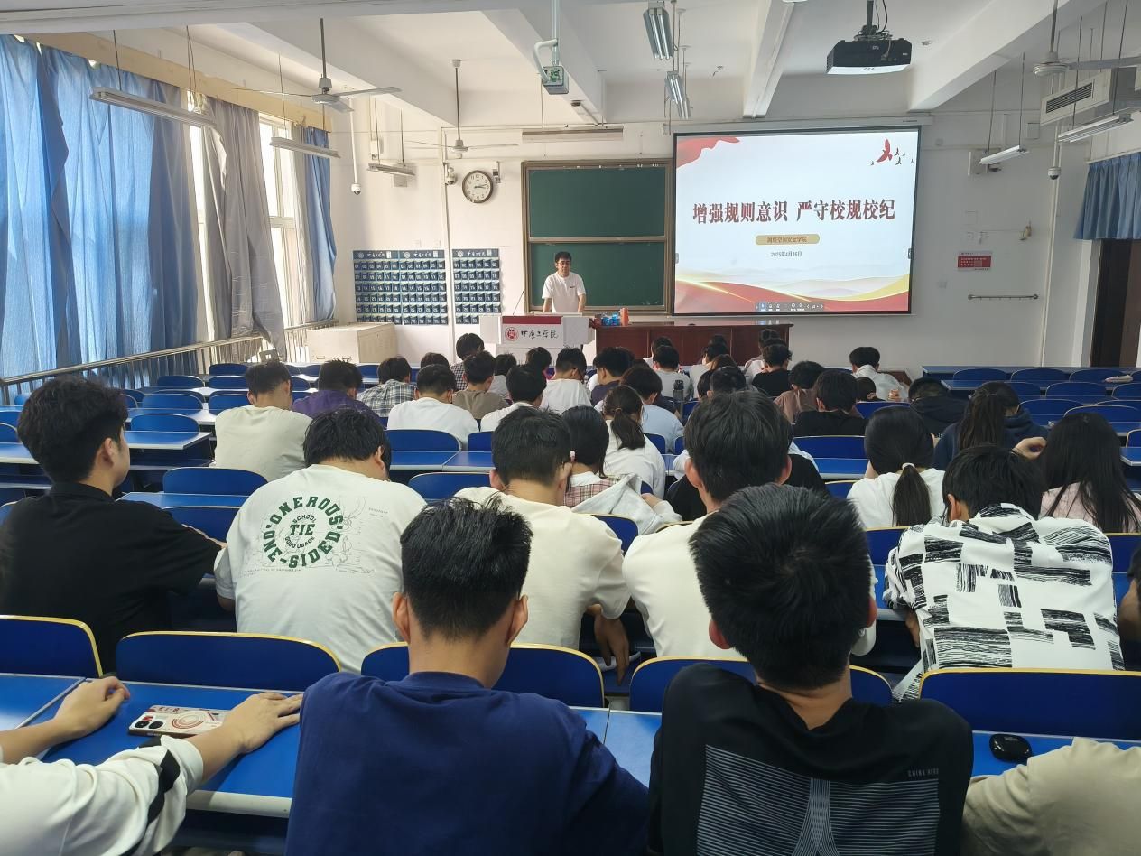 于4月16日下午在三号教学楼329召开校规校纪主题班会,会议由学工办副主任郭政良主持,学院全体本科生参加。