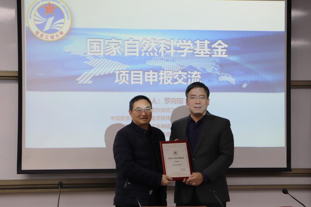 青年教师作了题为《新时代信息技术的机遇与挑战——国家自然科学基金申报方法交流》的讲座。讲座开始前,科技处处长宋晓炜为罗向阳颁发了“弘德讲坛”主讲证书,讲座由科技处副处长郑慧凡主持。