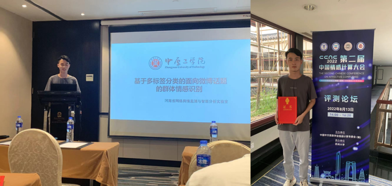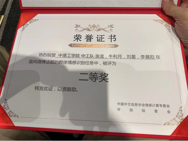 学生牛丽月、刘星、李晨阳,指导老师张龙,在技术评测任务“面向微博话题的群体情感识别任务”中荣获二等奖(第二名)的好成绩。
