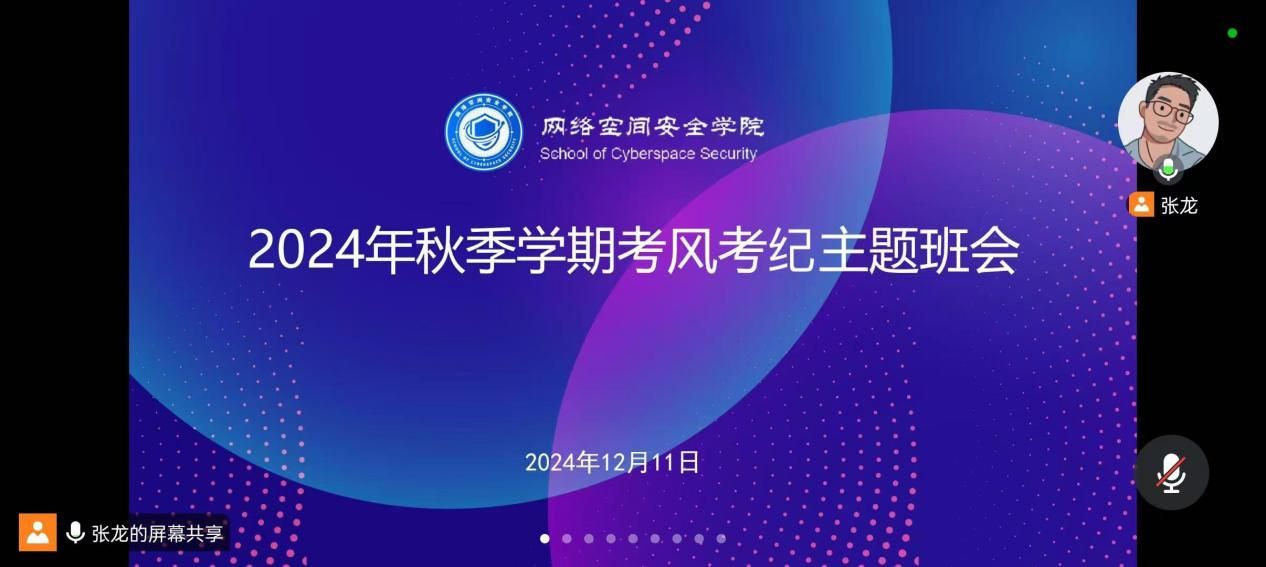于12月11日晚8点,召开2024年秋季学期考风考纪主题班会线上会议,此次会议由班主任张龙老师主持,全体本科生参加。